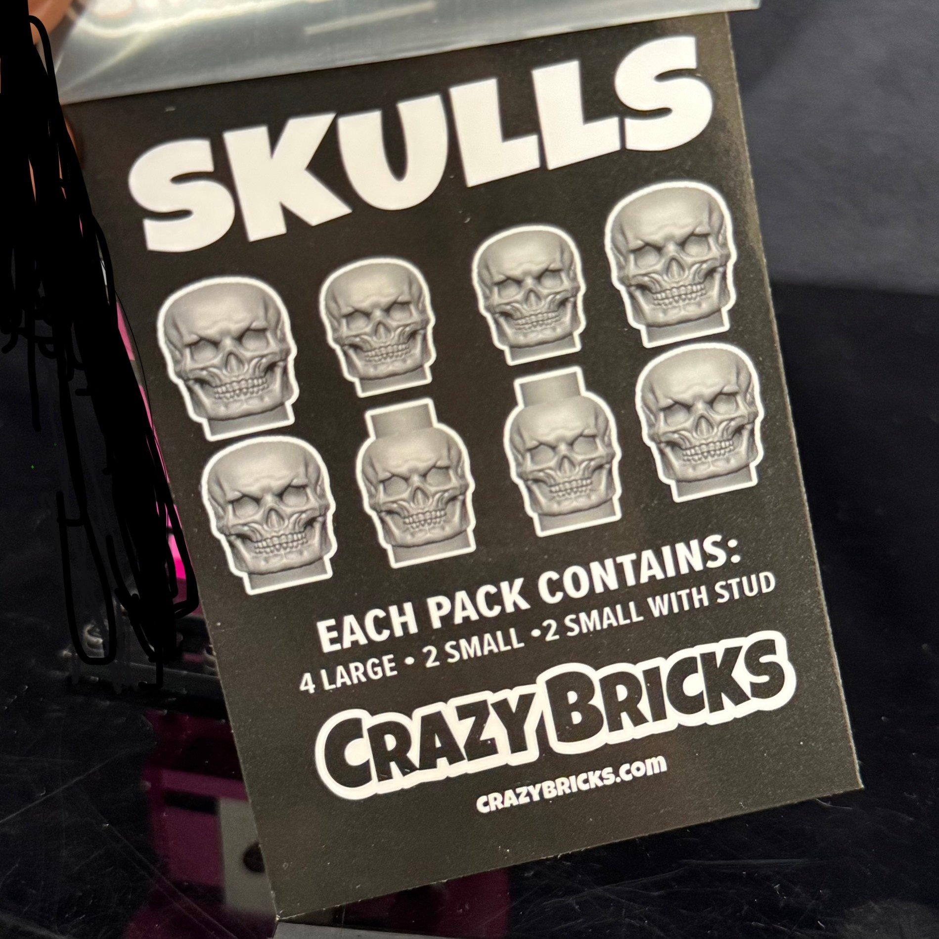 This 8-Skull pack comes on hanger ready tags. Each set includes (4) large Skulls, (2) small skulls and (2) small skulls with a stud on top. Final Colors and variants will depend upon the total number of figures ordered by BAM